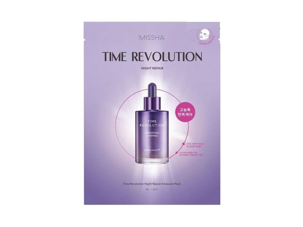 MISSHA TIME REVOLUTION Night Repair Ampoule Mask The Night Repair Ampoule Mask with 77.2% Extreme Biome™ of 10 different highly concentrated fermented ingredients effectively improves skin elasticity and nourishment. Vegan mask with ultra-gentle compression technology and three layers ensures optimal absorption of nutrients into the skin.