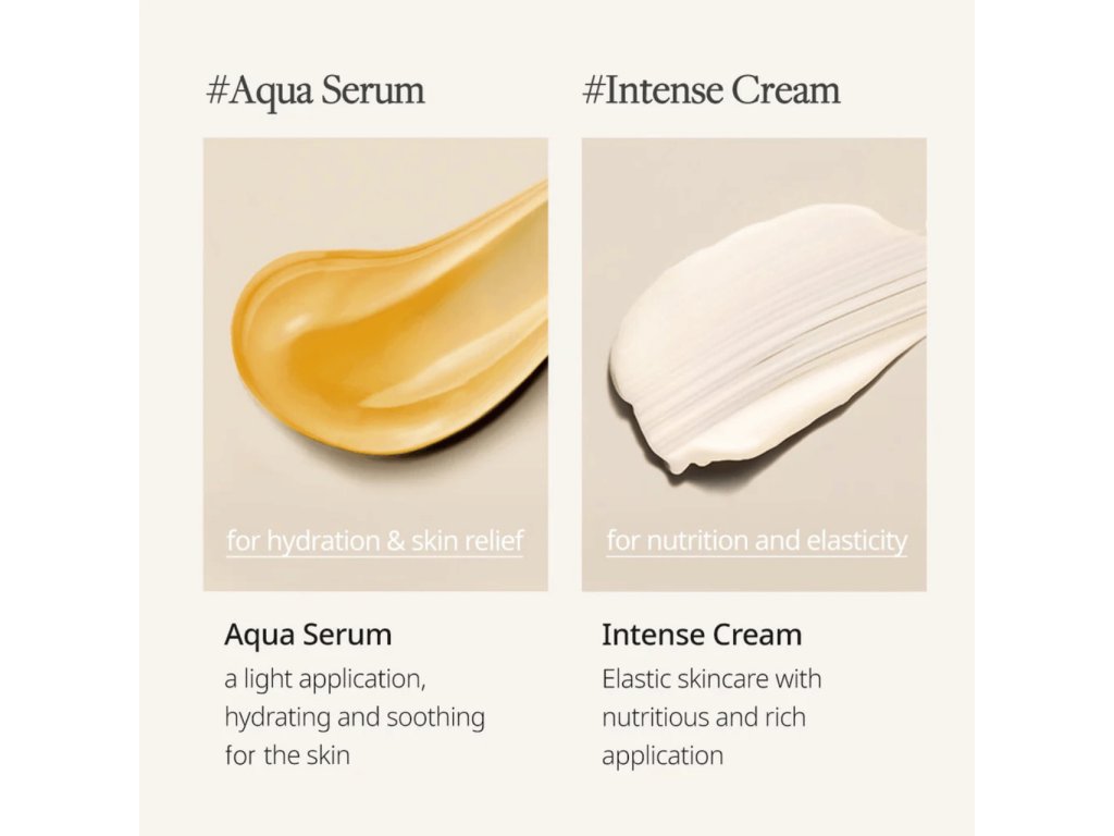 | Composition: | [AQUA SERUM] Water, Propanediol, 1,2-Hexanediol, Glycerin, Panthenol, Laminaria Japonica Extract, Eclipta Prostrata Leaf Extract, Centella Asiatica Extract, Ficus Carica (Fig) Fruit Extract, Melia Azadirachta Leaf Extract, Melia Azadirachta Flower Extract, Curcuma Longa (Turmeric) Root Extract, Anthemis Nobilis Flower Extract, Anastatica Hierochuntica Extract, Calendula Officinalis Flower Extract, Tuber Magnatum Extract, Malt Extract, Ocimum Sanctum Leaf Extract, Corallina Officinalis Extract, Hydrogenated Lecithin, Sodium Hyaluronate, Acrylates/C10-30 Alkyl Acrylate Crosspolymer, Octyldodeceth-16, Butylene Glycol, Tromethamine, Disodium Edta, Adenosine, Fructooligosaccharides, Glyceryl Polymethacrylate, Beta-Glucan, Sodium Polyacrylate, Pvm/Ma Copolymer, Hydrolyzed Hyaluronic Acid, Ceramide Np, Tocopherol, Fragrance, Ethylhexylglycerin [INTENSE CREAM] Water, Glycerin, Hydrogenated Polydecene, Caprylic/Capric Triglyceride, Phenyl Trimethicone, Betaine, Polyglyceryl-3 Methylglucose Distearate, Cyclohexasiloxane, Cetyl Alcohol, Macadamia Integrifolia Seed Oil, Phytosteryl/Isostearyl/Cetyl/Stearyl/Behenyl Dimer Dilinoleate, Glyceryl Stearate, Behenyl Alcohol, Trehalose, Pentaerythrityl Distearate, Collagen Extract, Laminaria Japonica Extract, Eclipta Prostrata Leaf Extract, Centella Asiatica Extract, Ficus Carica (Fig) Fruit Extract, Melia Azadirachta Leaf Extract, Melia Azadirachta Flower Extract, Curcuma Longa (Turmeric) Root Extract, Nelumbo Nucifera Flower Extract, Rose Extract, Jasminum Officinale (Jasmine) Extract, Narcissus Pseudo-Narcissus (Daffodil) Flower Extract, Lilium Candidum Bulb Extract, Iris Versicolor Extract, Freesia Refracta Extract, Tuber Magnatum Extract, Malt Extract, Ocimum Sanctum Leaf Extract, Corallina Officinalis Extract, Anemarrhena Asphodeloides Root Extract, Sodium Hyaluronate, Hydrogenated Lecithin, Oenothera Biennis (Evening Primrose) Oil, Glycine Soja (Soybean) Oil, Camellia Japonica Seed Oil, Macadamia Ternifolia Seed Oil, Hippophae Rhamnoides Fruit Oil, Persea Gratissima (Avocado) Oil, Olea Europaea (Olive) Fruit Oil, Helianthus Annuus (Sunflower) Seed Oil, Ammonium Acryloyldimethyltaurate/Vp Copolymer, Polyglyceryl-10 Laurate, Butylene Glycol, Sodium Stearoyl Glutamate, Adenosine, Fructooligosaccharides, Disodium Edta, Beta-Glucan, Hydrolyzed Hyaluronic Acid, Ceramide Np, Glucose, Mannose, Butyrospermum Parkii (Shea) Butter, Hydrogenated Polyisobutene, Tocopherol, 1,2-Hexanediol, Fragrance, Hydroxyacetophenone, Ethylhexylglycerin |
