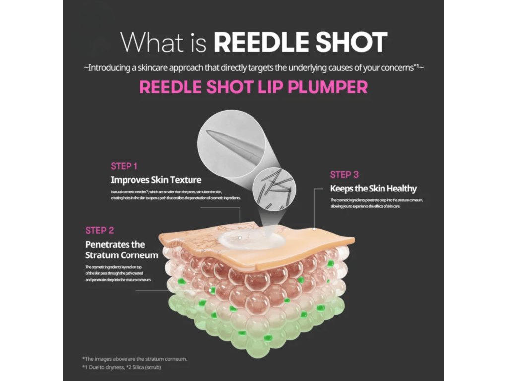 Experience the instant effect of fuller lips with VT COSMETICS - REEDLE SHOT LIP PLUMPER EXPERT. Its unique "reedle shot" technology uses fine microneedles combined with active ingredients such as menthyl lactate, propolis and Centella Asiatica extract to stimulate the lips, increasing their volume while nourishing and protecting. After the first application, you'll feel a pleasant tingling sensation and after a while you'll see a fuller, juicier effect - without the need for fillers or injections.