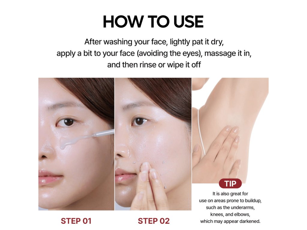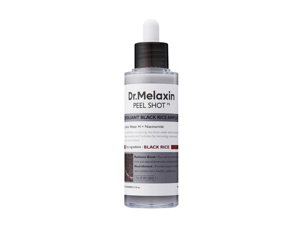 DR. MELAXIN Peel Shot Exfoliant Black Rice Ampoule delivers an exclusive combination of gentle peeling and black rice to deeply smooth the skin. This exfoliating ampoule concentrate uses salicylic acid and gluconolactone to gently remove dead skin cells, hydrate and soothe sensitive skin.