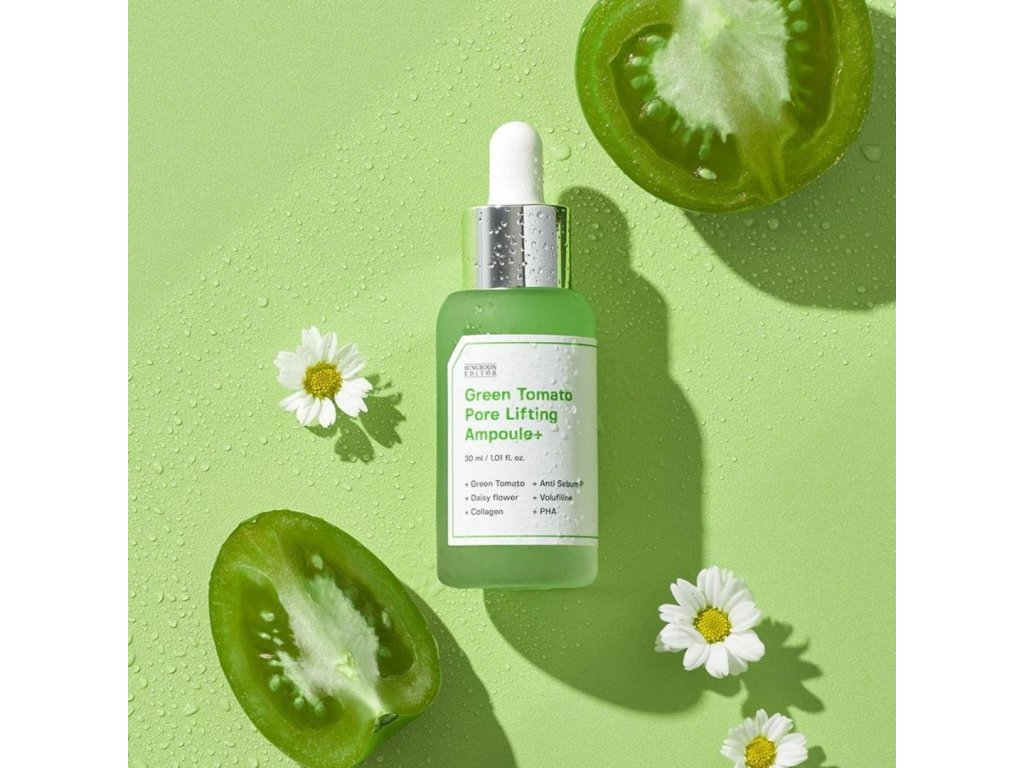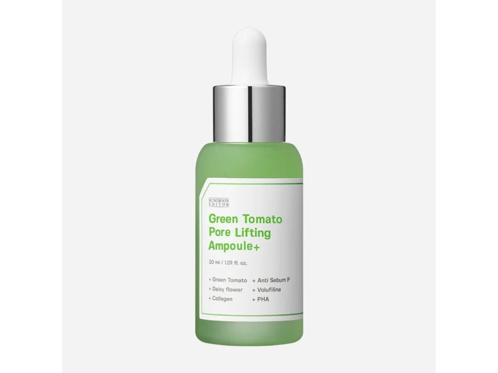 Sungboon Editor Green Tomato Pore Lifting Ampoule Pore Tightening Serum with Green Tomato will rejuvenate your skin while tightening unwanted enlarged pores thanks to tomato extract. The non-greasy textured serum has a lifting and moisturising effect thanks to collagen, while allantoin hydrates and soothes the skin. The essence, which is quickly absorbed into the skin, also controls sebum production with the help of the Anti-Sebum P complex , while niacinamide brightens skin with hyperpigmentation or dark spots. MAIN COMPONENTS- Green tomato extract effectively tightens enlarged skin pores
