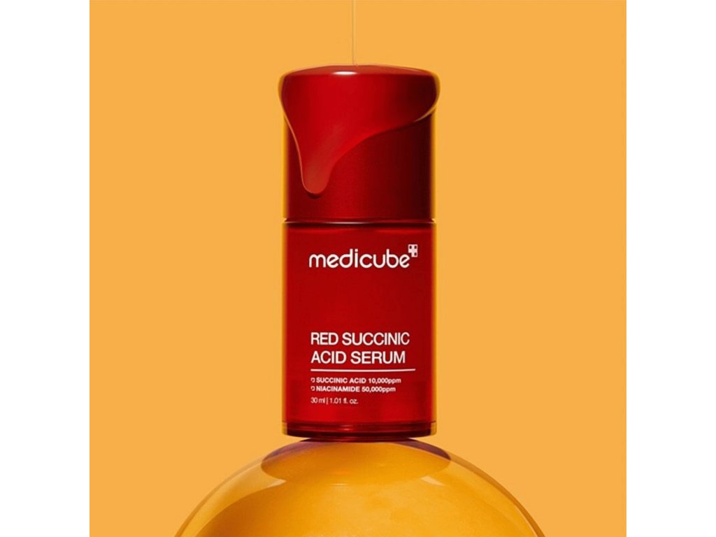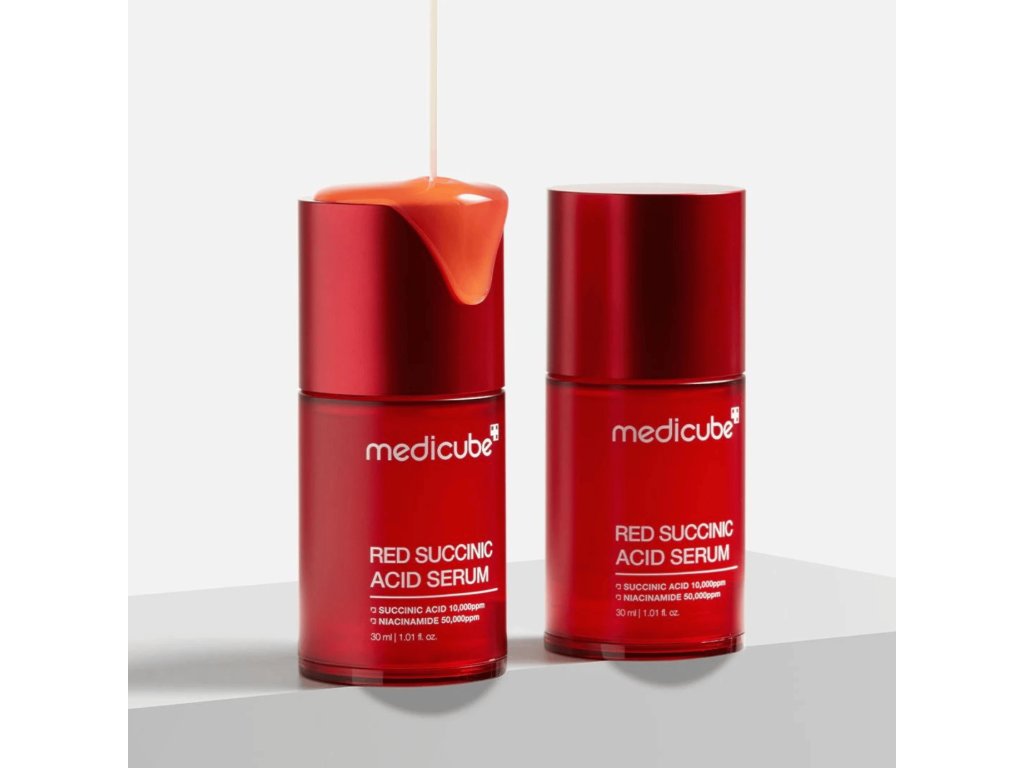 MEDICUBE Red Succinic Acid Clarifying Serum delivers an innovative formula with 5% Niacinamide and 1% Succinic Acid for highly effective skin detoxification. It gently removes dead skin cells and excess oil, while a ceramide and panthenol complex soothes - use is simple, just 2 pumps after cleansing.