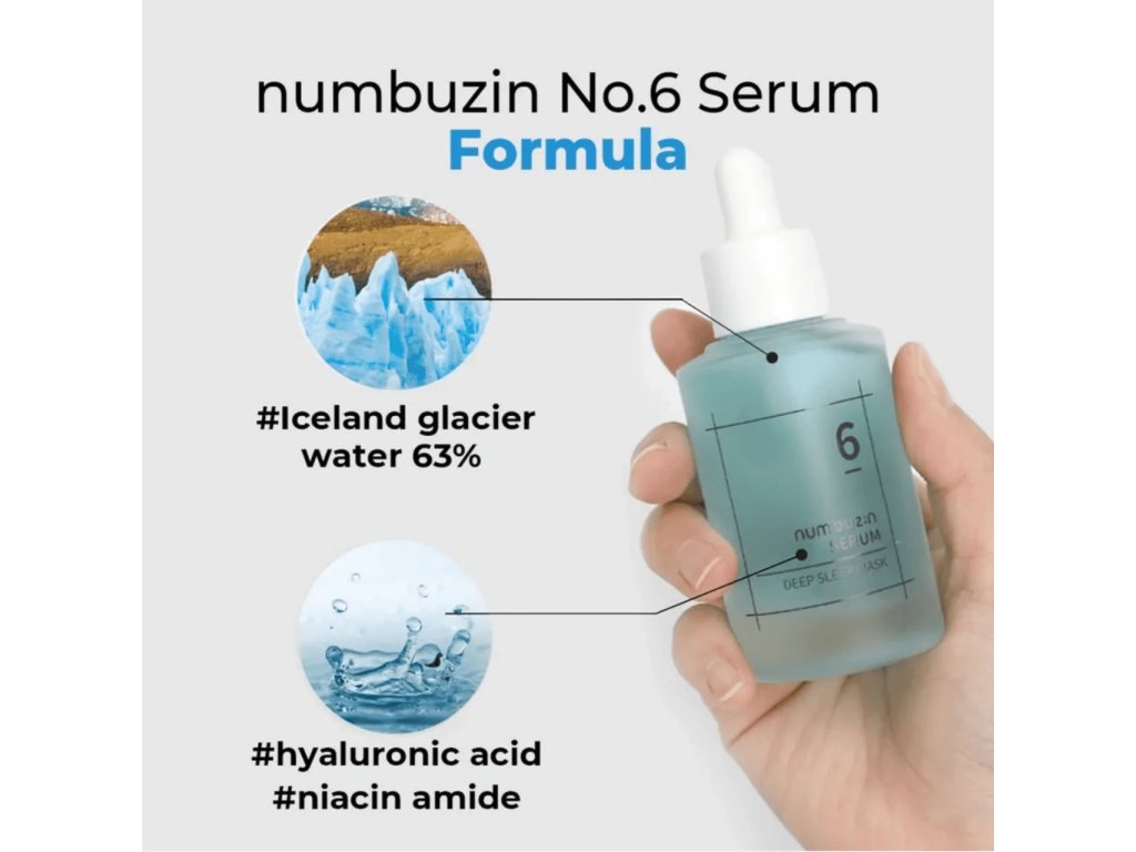 Dive into a dreamy world of hydration with NUMBUZIN No. 6 Deep Sleep Mask Serum - a serum that will pamper your skin during the night like a luxurious spa treatment. Thanks to algae extract and 63% glacier water, it will leave your skin feeling nourished and refreshed. And in the morning? Radiant, soothed and soft skin ready to glow.