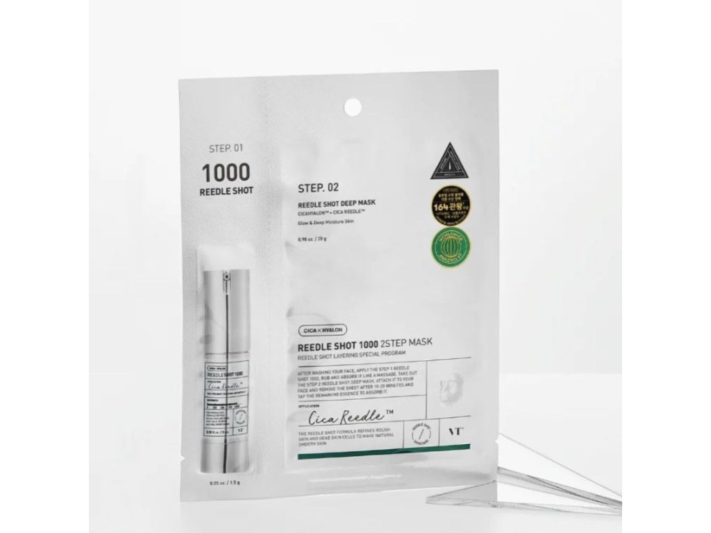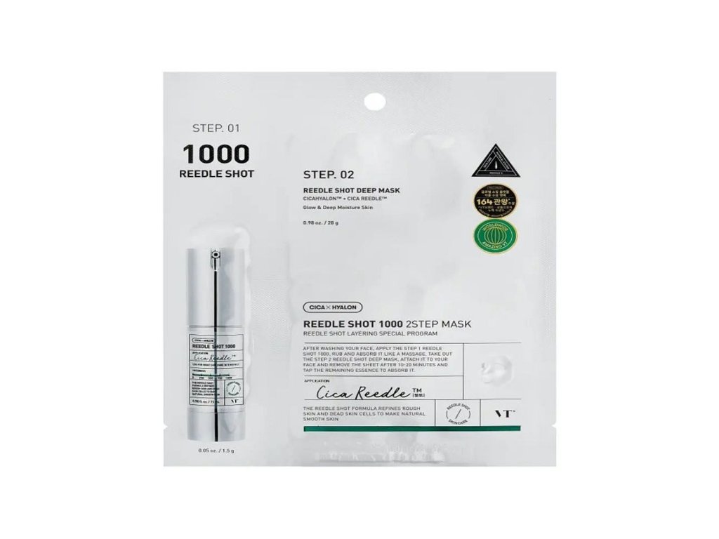 VT Cosmetics Reedle Shot 1000 2-Step Mask The Reedle Shot 1000 2-Step Microneedle Face Mask is an innovative mask that combines two skin care steps for maximum effectiveness. The first step contains Reedle Shot 1000 serum for easy absorption of active ingredients while minimizing enlarged pores, while the second step is a vegan hydrating mask that locks nutrients into the skin and soothes.